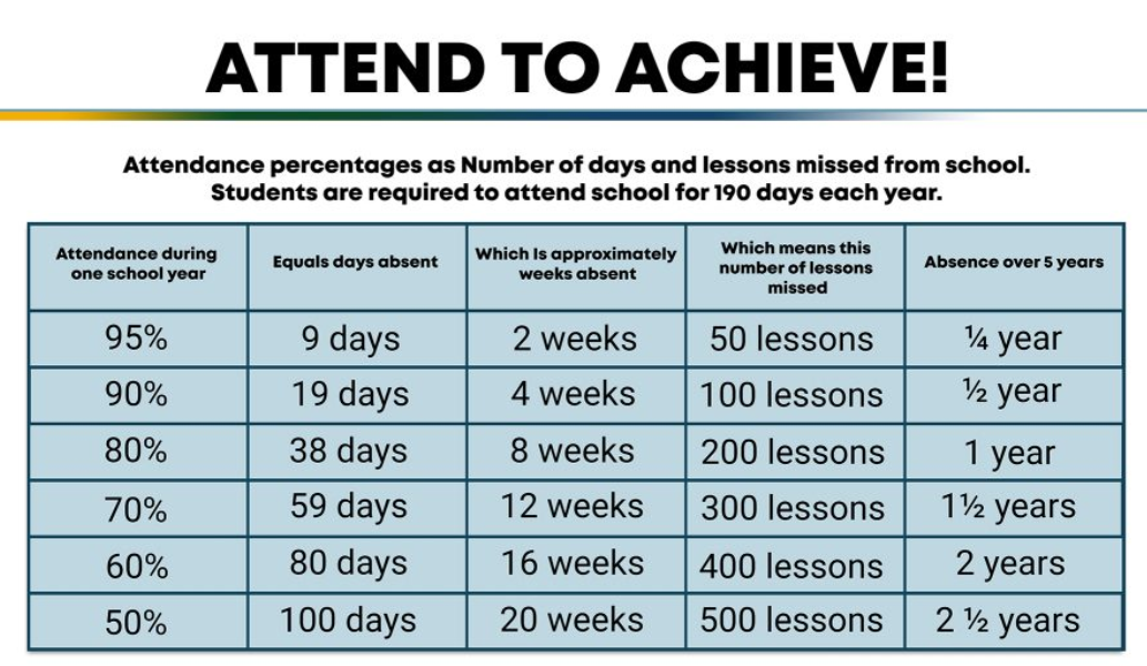 What does your child’s percentage attendance mean? Parents/carers can be unsure about what good attendance looks like. As a school our target attendance is 95%. If a child’s attendance drops below 95%, they are missing out on a significant amount of lessons which can affect their progress. For example, missing a few days here and there might not seem like much, but over the course of a year, it adds up. This is why poor attendance often leads to slower academic progress.